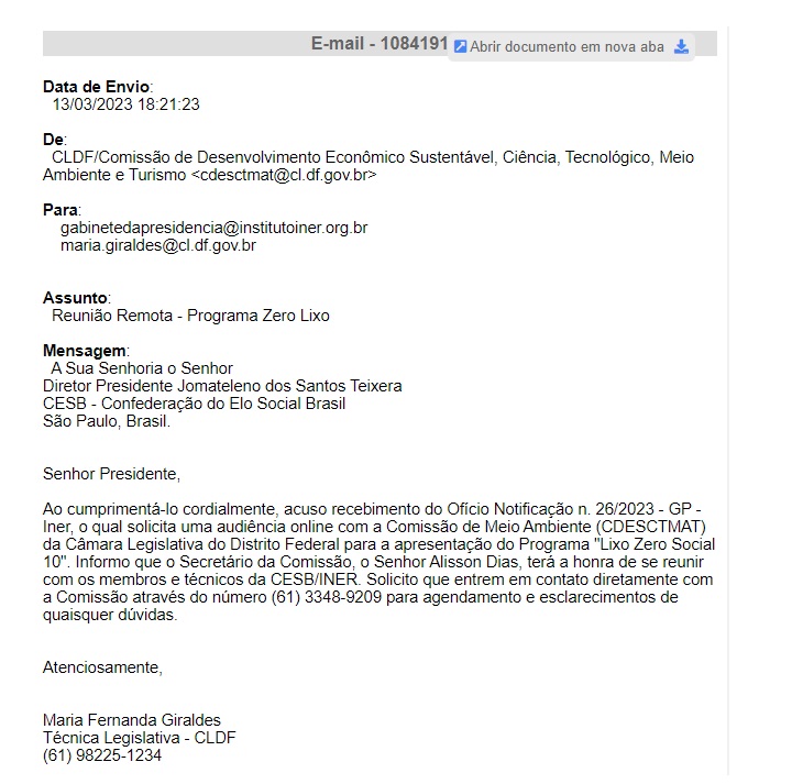 A Comissão do Meio Ambiente do Distrito Federal receberá a CESB – Confederação do Elo Social Brasil – em audiência por determinação da presidência da CLDF – Câmara Legislativa do Distrito Federal para apresentação do programa “Lixo Zero, Social 10”, através do sistema INER de resíduos sólidos.